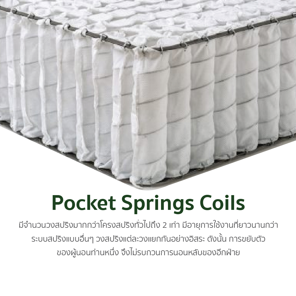 Advanced Pocket Coil System: ระบบสปริงแยกอิสระ (Pocket Spring) ที่ทำงานแยกจากกัน 100% ทำให้สามารถรองรับส่วนโค้งเว้าของสรีระได้อย่างละเอียดแม่นยำ และที่สำคัญที่สุดคือ “Zero Motion Transfer” จะไม่รู้สึกถึงแรงสั่นสะเทือนเมื่อมีการขยับตัว มอบความเป็นส่วนตัวสูงสุดในทุกค่ำคืน - The Perfect Balance of Soft & Firm: การผสานชั้นวัสดุพิเศษคุณภาพสูงที่ผ่านการทดสอบมาอย่างดี เพื่อให้ได้สัมผัสที่ “นุ่มแต่ไม่ยุบตัว” และ “แน่นแต่ไม่กระด้าง” มอบความสบายที่เป็นเอกลักษณ์ระดับพรีเมี่ยม
